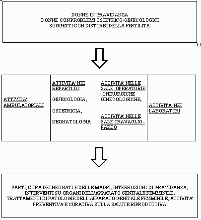 Il primo riquadro del flow chart 1/a mostra la tipologia dell'utenza che ha accesso al sistema produttivo. L'affluenza di donne con gravidanza fisiologica e dei soggetti con disturbi della fertilità è programmata. L'affluenza di donne con problemi ostetrico e/o ginecologici viene programmata solo in parte, mentre per buona parte si deve tenere conto dei problemi di urgenza e di emergenza. Le attività si svolgono all'interno degli ambulatori, dei reparti (ginecologia, ostetricia, neonatologia), delle sale operatorie (ginecologiche ed ostetriche) e, dove presenti, dei laboratori come indicati nel secondo riquadro del flow chart 1/a. Tali strutture sono variamente collegate fra loro, seguendo le esigenze dei singoli casi che si presentano. Le attività svolte vengono registrate con strumenti diversi (prevalentemente tramite le registrazioni dei DRG e la compilazione delle schede di dimissione ospedaliera). I reparti ospedalieri del settore materno infantile della città di Firenze comprendono 4 punti nascita, che includono le maternità, le ginecologie e le neonatologie. Tre di queste sono strutture pubbliche ed una è privata, convenzionata con il Servizio Sanitario Nazionale.Sono ubicate all'interno dei confini geografici della città o nell'immediata vicinanza (vedi carta allegata). In tutto si sono riscontrate un totale di 5 sale operatorie per interventi ginecologici, 5 stanze per il travaglio, 6 sale travaglio/parto, 7 sale parto e 12 reparti di degenza ginecologica, ostetrica e neonatologica, 2 terapie sub-intensive e 1 intensiva neonatali.