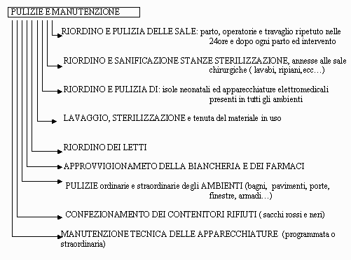 Le malattie professionali che l'INAIL ha registrato sono state: 5 dermatiti. Sono previsti vari tipi di manutenzione ordinaria e straordinaria che possono riguardare le strutture (edificio), gli impianti di condizionamento, gli impianti di alimentazione di gas medicali, le macchine e le apparecchiature. Questo tipo di manutenzioni viene gestite quasi esclusivamente tramite appalti esterni. All'interno delle aziende sanitarie esistono unità tecniche deputate al controllo e alla gestione delle ditte di manutenzione. La pulizia degli ambienti viene suddivisa fra personale dipendente dell'azienda e dipendenti delle ditte in appalto (più numerosi). Solitamente il personale dipendente effettua la propria opera di pulizie nelle sale parto e chirurgiche. Gli operatori delle ditte di pulizia in appalto lavorano negli spazi comuni (scale, corridoi…). La raccolta dei rifiuti viene effettuata dal personale sanitario dipendente nelle prime fasi e successivamente da personale di ditte in appalto, alcune di esse specializzate. Spetta al personale dipendente la chiusura dei sacchi e lo stoccaggio in appositi locali interni all'ospedale. La ditta che effettua le pulizie ordinarie effettua il ritiro dei sacchi (ma anche la chiusura di quelli rimasti aperti), i quali vengono stoccati in depositi esterni, seguendo i criteri della raccolta differenziata per i rifiuti assimilabili agli urbani, per i rifiuti speciali (per il rischio biologico), per la carta e per il vetro. Altre ditte sono incaricate del prelievo da questi ultimi punti di stoccaggio. Anche lo smaltimento dei rifiuti tossici (solventi) provenienti da tali strutture sanitarie viene gestito per la maggior parte da ditte esterne. Si riporta a seguito la descrizione di alcuni rischi che possiamo considerare trasversali nel comparto in esame, indipendenti o solo parzialmente correlati, in senso quantitativo, alle fasi lavorative esaminate. Rischi strutturali : le condizioni delle strutture murarie in toto, dei pavimenti, delle pareti, delle uscite e delle porte dipendono in buona parte dagli anni di progettazione e costruzione dell'immobile. Le ristrutturazioni degli stessi, seppure importanti, spesso riescono a compensare solo in parte le carenze. La struttura più vecchia (anni di inizio costruzione 1939-45) risente più facilmente della ristrettezza degli spazi. Ciò potrebbe aumentare la probabilità che si verifichino infortuni tipicamente descritti in ambiente ospedaliero quali la caduta, lo scivolamento, lo schiacciamento, sia durante l'accudimento degli ospiti, che trasportando materiale, oppure salendo scale od effettuando la pulizia degli ambienti. La presenza invece di alcune irregolarità nella copertura delle superfici e di alcune infiltrazioni di acqua nei semi-interrati possono comportare soprattutto problemi di tipo igienico-ambientale (agenti biologici e microclima). Si consideri, inoltre, che in condizioni di spazi ristretti si è riscontrata frequentemente la carenza di docce e spogliatoi, adeguati e disponibili nelle immediate vicinanze del luogo di lavoro, per il personale. Rischio elettrico : le numerose apparecchiature elettriche ed elettroniche utilizzate nei reparti, nelle sale e nelle nursery costituiscono un potenziale pericolo per personale e pazienti. Le situazioni di rischio elettrico più immediate possono essere date da presenza di fili scoperti, prese difettose, corto circuiti o contatti negli apparecchi, una messa a terra non ben distribuita. Per il rischio elettrico esistono norme CEI 64-4, che forniscono indicazioni per gli impianti elettrici in locali adibiti ad uso medico e raccomandazioni per ridurre al minimo questo tipo di rischio: controllare periodicamente l'intensità delle correnti di dispersione e l'efficienza del collegamento di terra nelle apparecchiature utilizzate; formare il personale di assistenza a riconoscere situazioni potenzialmente pericolose; servirsi per le riparazioni esclusivamente di personale tecnico specializzato. Nelle unità oggetto di studio, la maggior parte degli impianti elettrici è stata ultimamente revisionata e le apparecchiature sono state sottoposte a controlli periodici più capillari negli ultimi 2 anni. Gli impianti elettrici vengono sottoposti a verifiche semestrali, mentre le verifiche sui gruppi elettrogeni vengono effettuate ogni 1 o 2 settimane. L'esito delle verifiche viene appuntato su appositi registri, in alcuni casi è previsto il potenziamento del gruppo elettrogeno, soprattutto conseguentemente alle più recenti revisioni ed ampliamenti che hanno comportato carenze nelle garanzie di collegamento al gruppo elettrogeno nei casi di emergenza. Rischio incendio : alcune delle strutture analizzate vengono considerate ad alto rischio di incendio in quanto c'è: