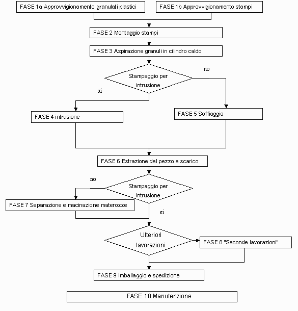 Nell'intrusione la plastica si trova totalmente racchiusa tra due stampi senza presenza di aria. Nel soffiaggio un cilindro cavo di plastica semifusa viene lasciato scendere per un tratto prestabilito, fino a che due stampi cavi lo racchiudono completamente. Allora viene soffiata aria in modo da garantire l'aderenza della materia plastica con gli stampi. In fase di apertura degli stampi una lama tagliente separa il prodotto finito dal rimanente cilindro di plastica semifusa. Una analisi più dettagliata delle singole fasi del ciclo produttivo riportata nel grafico che segue (flow-chart). .In appalto da ditte esterne possono essere effettuate le seguenti lavorazioni: produzione di stampi;Verifica della qualità;