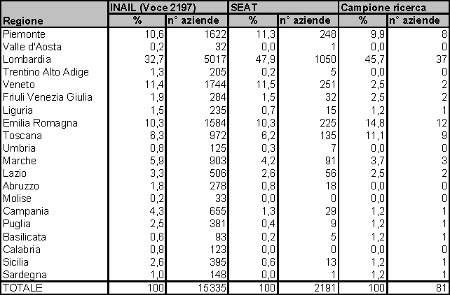 Sulla base di questi dati stato selezionato un campione di aziende ai fini della presente ricerca che avesse una distribuzione geografica percentuale equivalente alle precedenti, in modo da poter verificare quantitativamente la corretta attribuzione di ricerca su un campione di carattere nazionale.
